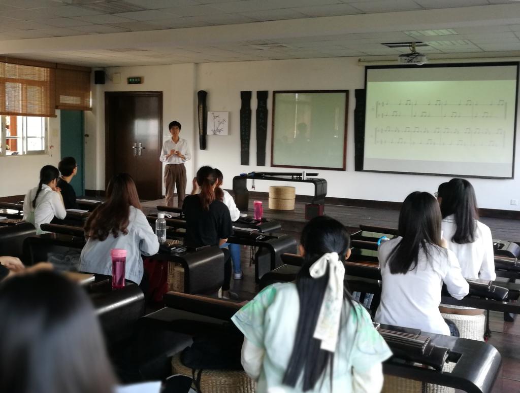 5月11日下午,龙人古琴研究院副经理、福建省古琴技艺传承人张锦冰在pa娱乐游戏古琴教室面向琴歌课程的同学作“宋代弦歌的文化阐释及演唱方法”的主题讲座。