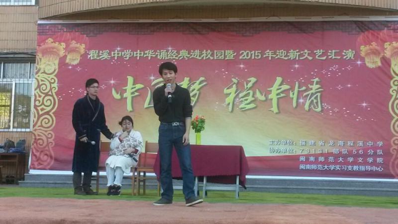 12月28日下午,pa娱乐游戏课本剧实践基地之一——程溪中学成功举办中华诵经典进校园暨2015年迎新文艺汇演。此次演出由龙海市程溪中学主办、73131部队56分队、pa娱乐游戏、pa娱乐游戏官网实习支教指导中心协办。pa娱乐游戏杨娟娟老师、团委书记陈文婷老师及程溪中学董事长陈建议、73131部队领导等与广大师生一起兴致盎然地观看了演出。