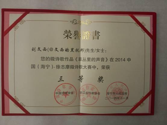 2014年11月19日,为纪念诗人徐志摩先生而创办的中国(海宁)·徐志摩微诗歌大赛落下帷幕,pa娱乐游戏12级刘文西同学以《草丛里声音》荣获大赛三等奖。 中国(海宁)·徐志摩微诗歌大赛前身为徐志摩诗歌奖,由中国诗歌学会、浙江省作协、海宁市人民政府,海宁文学艺术界联合会、海宁日报等单位主办,由大卫等当代著名诗人担任评委。此次大赛共收到10072首参赛作品,最终挑选出18件获奖作品。一等奖一件,二等奖三件,三等奖四件,优秀奖十件。