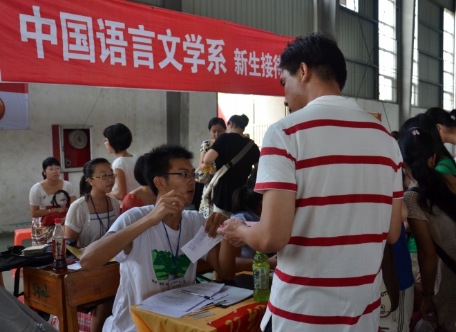 同学。老生们首先把新生的行李寄存好,接着帮助新生完成入学手续,最后