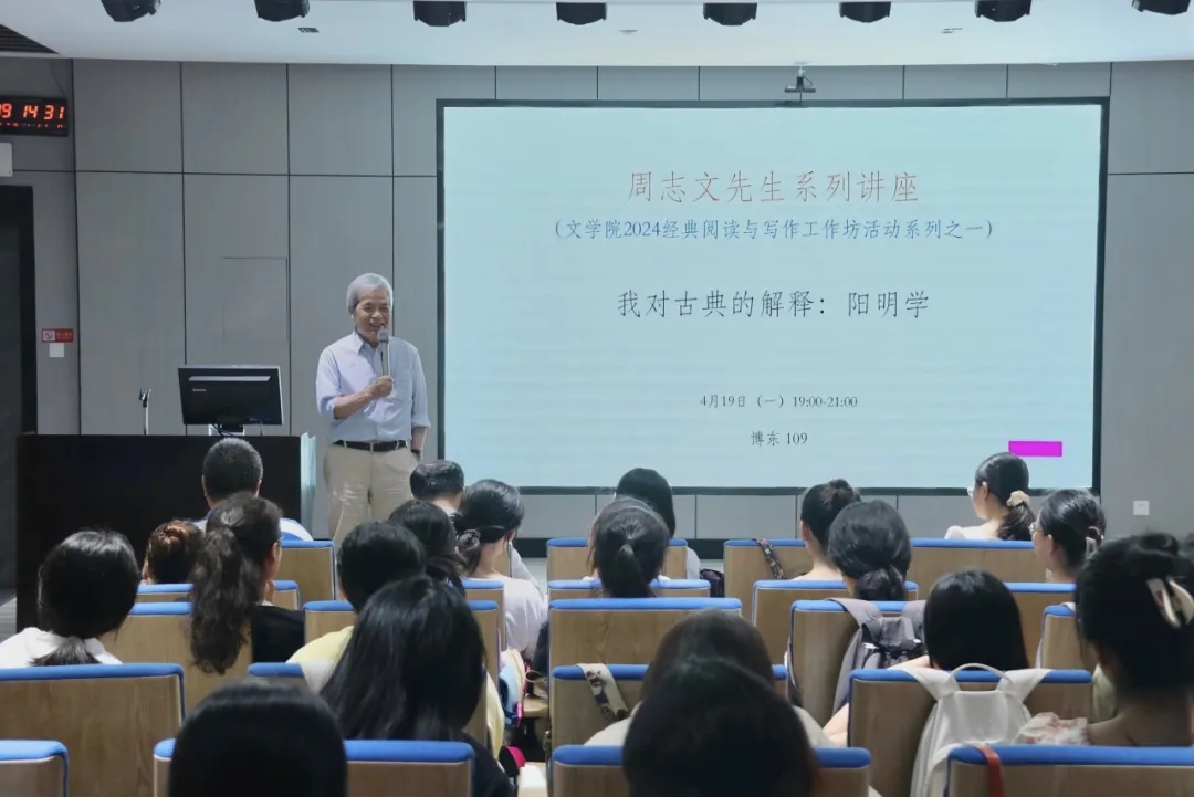为增进同学们对国学经典的理解,提升员工阅读与写作能力,pa娱乐游戏于4月15日晚上在博东109开展“我对古典的解释:阳明学”系列讲座。主讲人为台湾大学中国文学系教授周志文老师,多位pa娱乐游戏老师、员工到场聆听。本次讲座由古代文学教研室主任王朝华老师主持。