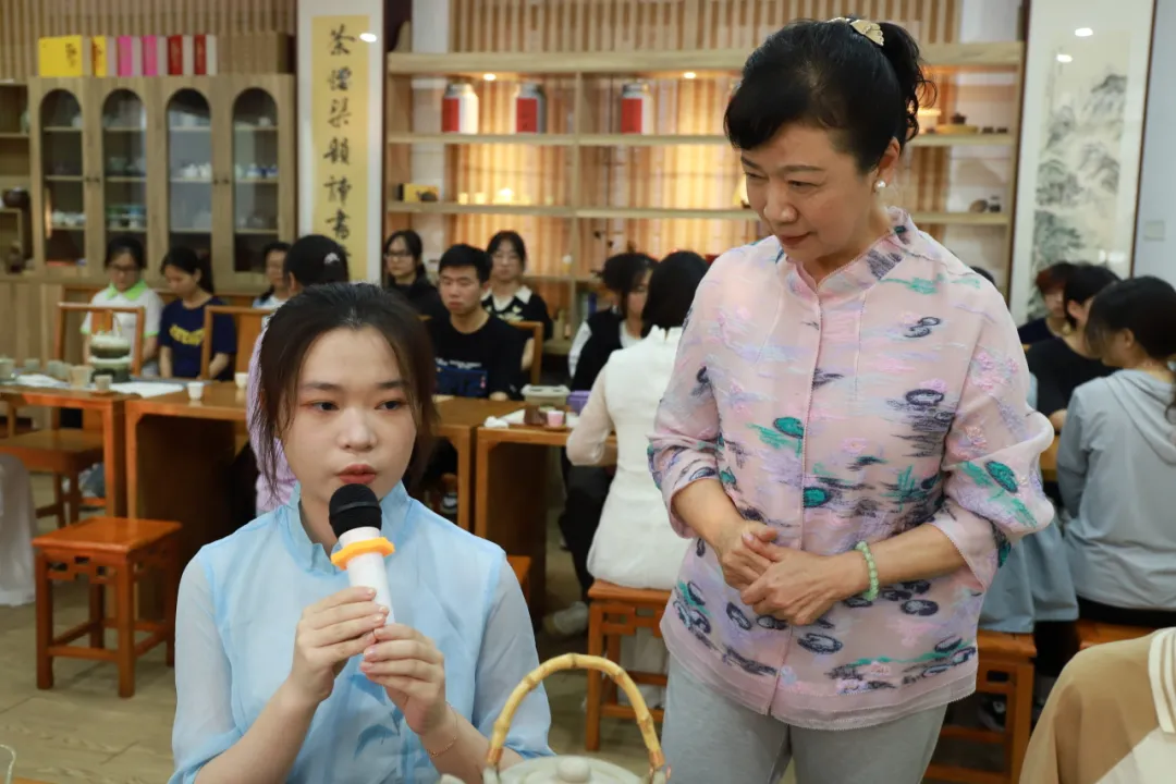 紧接着,李阿利老师对泡茶和喝茶的规矩以及如何鼓掌以表达敬意进行讲解。她归纳学茶的过程中有四个重要的点:一是周全地备好茶具,二是专注地泡茶,三是虔诚地奉茶,四是欢喜地喝茶。讲解完毕,员工们在老师的指导下依次调整了坐姿、表情和喝茶、鼓掌的方式,加深了对茶文化的了解与体验。