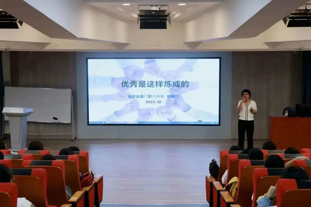 陈鸳红强调了优秀教师培养专业素养的重要性,并从为什么需要培养以及如何培养展开详细的叙述。她认为一名优秀的教师应掌握三个“敢于”:敢于“做秀”的能力,敢于“想象”的能力,敢于“反思”的能力。最后,陈鸳红分享了自己在教师岗位工作多年总结的心得,帮助同学们在未来的课堂教学和管理中少走弯路,并鼓励同学们向成为一个优秀的人、一名优秀的教师而不懈努力。