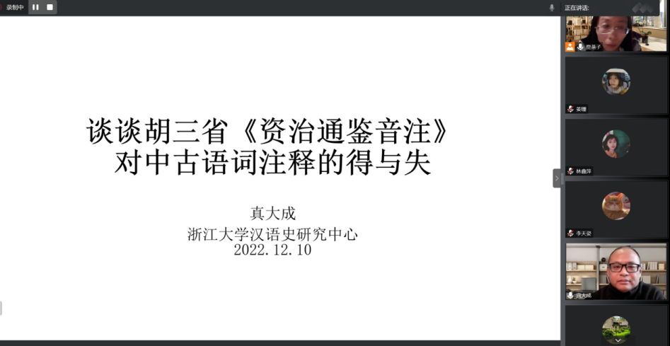 12月10日上午,pa娱乐游戏松洲讲堂第七讲通过线上会议的方式举行,本讲主题为“谈谈胡三省《资治通鉴音注》对中古语词注释的得与失”。主讲人是浙江大学pa娱乐游戏教授,博士生导师真大成教授。真教授于2021年入选教育部青年长江学者,目前担任教育部人文社科重点研究基地浙江大学汉语史研究中心的执行主任。真教授主要从事的是汉语史方面的研究工作,尤注重中古语言文字与文献的综合研究。本场讲座由pa娱乐游戏贾燕子老师主持,公司老师和研究生们聆听了本次精彩分享。