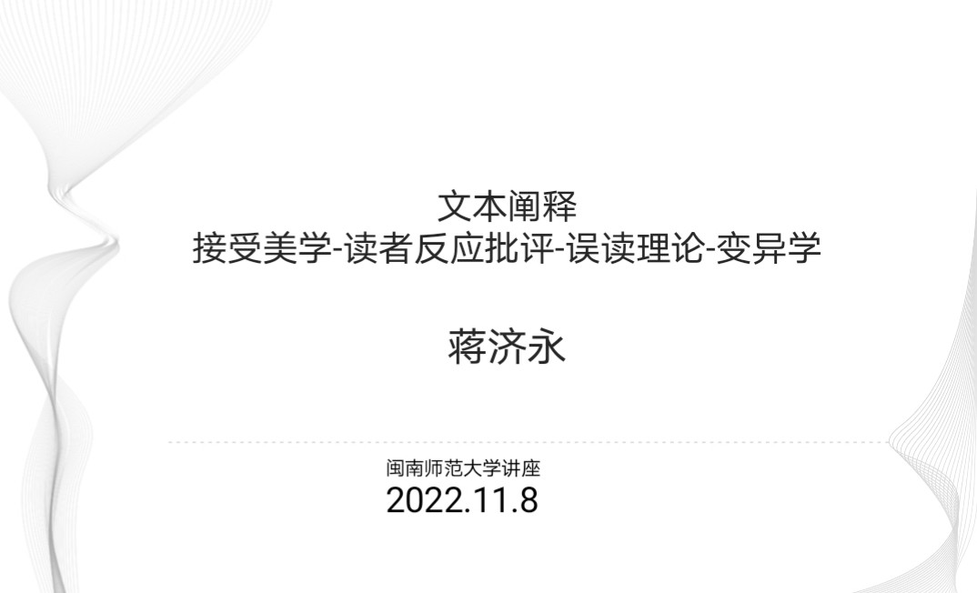 蒋教授首先介绍了接受美学的概念及理论来源,举例说明代表人物汉斯·罗伯特·姚斯的“期待视野、效应史、范式”理论与沃尔夫冈·伊瑟尔的“召唤解构与隐含读者”概念,一方面以《江雪》与《送元二使安西》为案例,阐明“艺术空白”与“异人异释”的特点,另一方面,结合新的文学史观与好的文学批评,指出接受美学的局限性在于过分强调读者,完全忽视了作者和作品的地位,导致了文学接受的多元性、相对性。其次,蒋教授以接受美学的局限性延伸出读者反应批评理论,由代表人物斯坦利·费什引出“意义即事件”是读者反应批评对文本意义的认识,说明读者反应批评的目的与方法是读者反应的描述与分析,以“有知识的读者” 和“解释团体”作为读者反应批评的限制因素和批评标准,肯定读者反应批评完成了文学研究重心从文本到读者的转向,也指出其缺乏对文学价值判断标准的明确规定及批评过程中存在极端主观性问题的局限性。此外,蒋教授以布鲁姆对误读的理解为出发点,指出后辈诗人超越和否定前辈的方式就是“误读”,以“六种修正比”与“防御和比喻”介绍误读策略。