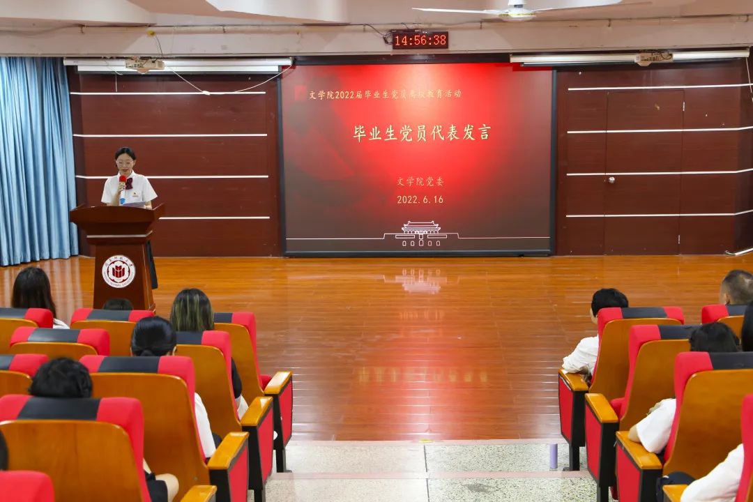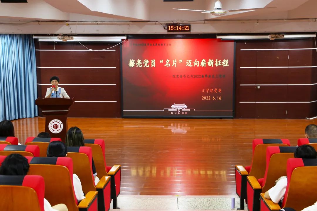 活动关键环节,赵丽霞以“擦亮党员“名片”,迈向崭新征程”为题,为毕业生党员讲授专题党课。她强调了在党的二十大召开之际学习党史的重要意义,并带领毕业生党员观看党史教育片,短片展示了中国共产党领导中国人民,为实现中华民族伟大复兴所进行的努力与探索,所经历的苦难与曲折以及所取得的胜利与辉煌。同时,她还就广大毕业生党员如何强化党性修养、做时代新人提出了三点希望与要求:一是坚定理想信念,不负时代所托。要将所知、所学应用于现实,服务社会,在知行合一中强化使命担当,在服务社会中实现个人价值;二是牢记党员身份,不负人民所愿。今后走上工作岗位,要在人民有难、党和国家有需要的时候,义无反顾地走在前、干在前,以实际行动践行使命担当;三是锤炼自身本领,不负青春所盼。不论今后从事何种职业,都能够始终秉持勤学敬业的精神、锤炼无私奉献的品格,敢于追求卓越,敢于乘风破浪,不断地向人生的新高峰发起攀登,书写出不负人民、不负时代的青春答卷。