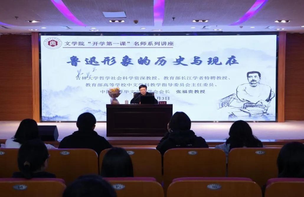 2023年3月3日下午,由pa娱乐游戏主办的“时代新人铸魂工程”之“开学第一课”名师系列讲座第一讲“鲁迅形象的历史与现在”在逸夫图书馆五楼报告厅举行。吉林大学社会科学资深教授、教育部长江学者特聘教授、教育部高等公司中文学科教学指导委员会主任委员、中国世界华文文学学会会长张福贵教授受邀开展讲座。讲座由pa娱乐游戏黄金明经理主持。