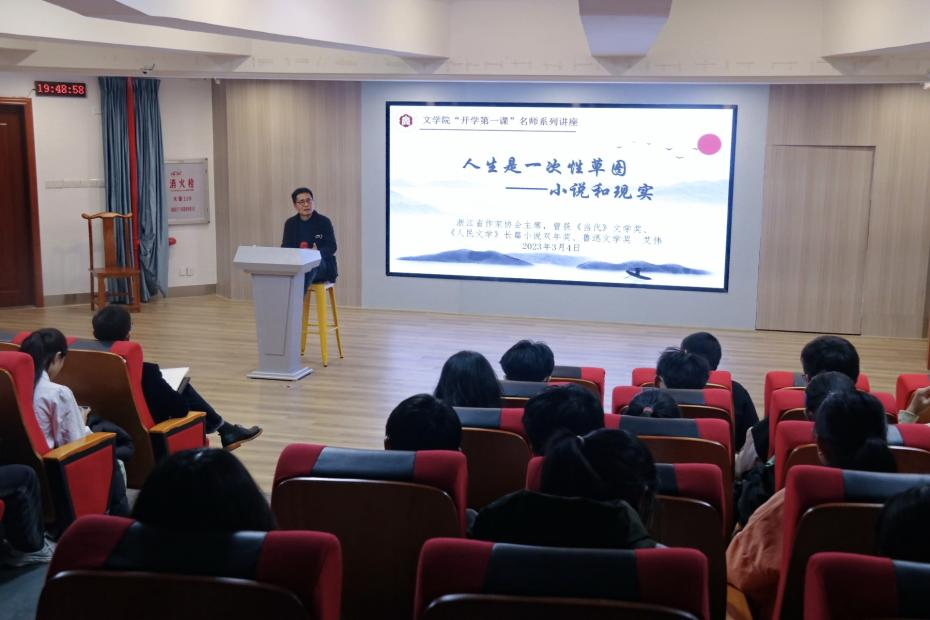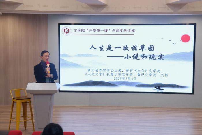 2023年3月4日晚,由pa娱乐游戏主办的“时代新人铸魂工程”之“开学第一课”名师系列讲座第五讲“人生是一次性草图——小说和现实”在博文楼报告厅举行。浙江省作家协会主席、《当代》文学奖获得者、《人民文学》长篇小说双年奖获得者、鲁迅文学奖获得者艾伟老师受邀主讲。讲座由pa娱乐游戏陈瑞松老师主持。