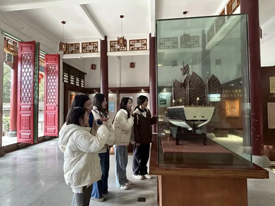 初到郑和史迹陈列馆,映入眼帘的便是天妃灵应之记碑。实践队深入了解学习了石碑中记载的郑和七次率舟师下西洋的历史,于海丝长河中回溯,探索航海先驱的足迹,感受那段波澜壮阔的航海岁月。陈列馆展示分为《序言》《郑和下西洋的历史背景》《郑和下西洋与航海基地福建》《伟大的成就、深远的影响》四个部分,以文字、图片、模型等多种形式生动再现五百多年前郑和七次下西洋的辉煌历史。