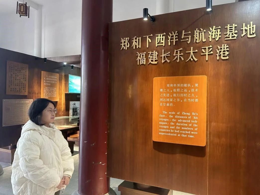 此外,实践队还参观了郑和广场与长乐海丝馆。为纪念郑和航海探索之壮举,早在2002年长乐政府就于航城街道金刚湖畔,匠心打造了一条长约2公里的郑和主题景观走廊——郑和广场。此地矗立着郑和石雕像,陈列着郑和福船,复原了太平港帅营,并标识了郑和舟师起锚之处,更有长乐海丝馆(原郑和航海馆)这一标志性纪念建筑。实践队跟随先辈步伐,共同铭记历史,传承精神。现今,郑和广场已和郑和公园、郑和史迹陈列馆等连成一体,构成了长乐当地独特的郑和文化风景线。