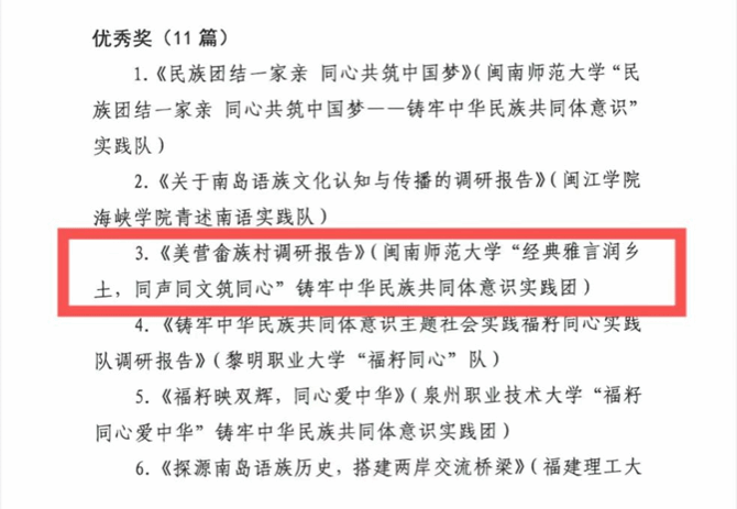“经典雅言润乡土,同声同文筑同心”铸牢中华民族共同体意识实践团所撰写的《美营畲族村调研报告》荣获2024年福建省“铸牢中华民族共同体意识·百校同心八闽行”专项活动优秀调研报告优秀奖。