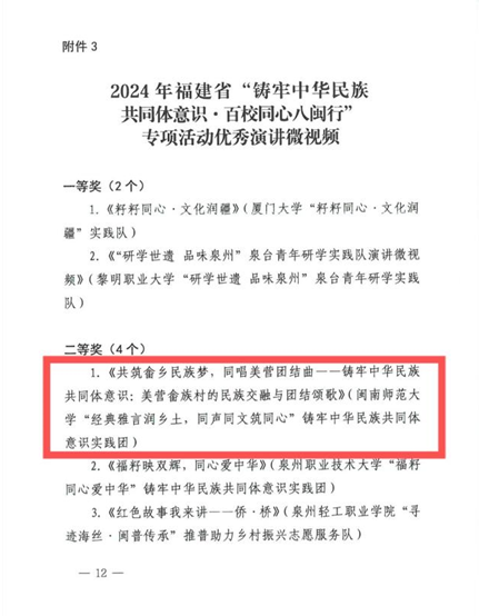 “经典雅言润乡土,同声同文筑同心”铸牢中华民族共同体意识实践团所录制的《共筑畲乡民族梦,同唱美营团结曲——铸牢中华民族共同体意识:美营畲族村的民族交融与团结颂歌》,荣获2024年福建省“铸牢中华民族共同体意识·百校同心八闽行”专项活动优秀演讲微视频二等奖。