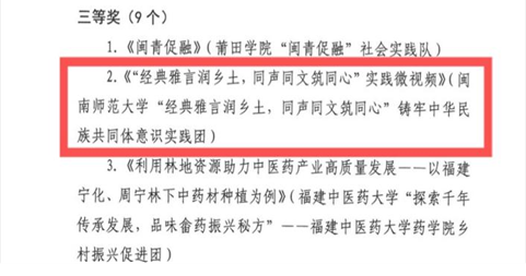 经典雅言润乡土,同声同文筑同心”铸牢中华民族共同体意识实践团作品《“经典雅言润乡土,同声同文筑同心”实践微视频》,荣获2024年福建省“铸牢中华民族共同体意识·百校同心八闽行”专项活动优秀实践微视频三等奖。