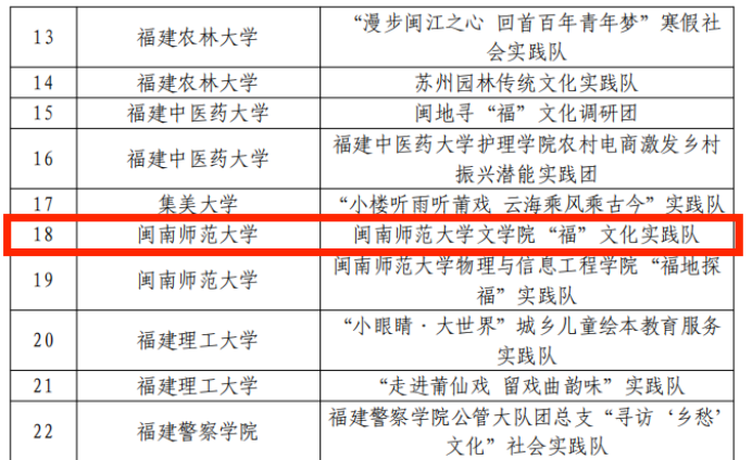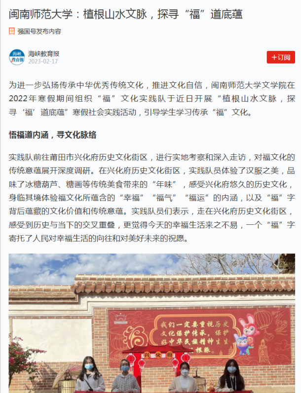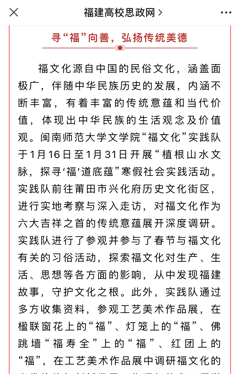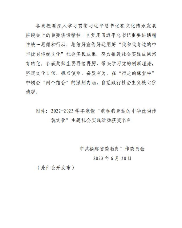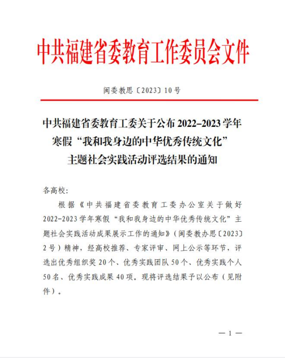 近日,中共福建省委教育工委发布《关于公布2022-2023学年寒假“我和我身边的中华优秀传统文化”主题社会实践活动评选结果的通知》,公司“福”文化实践队,在经过层层推荐、专家评审、网上公示等程序后,荣膺福建省2022-2023学年寒假“我和我身边的中华优秀传统文化”优秀实践团队。