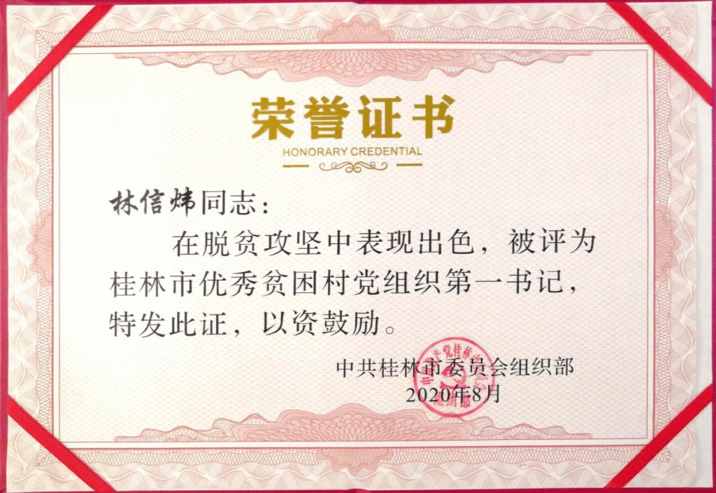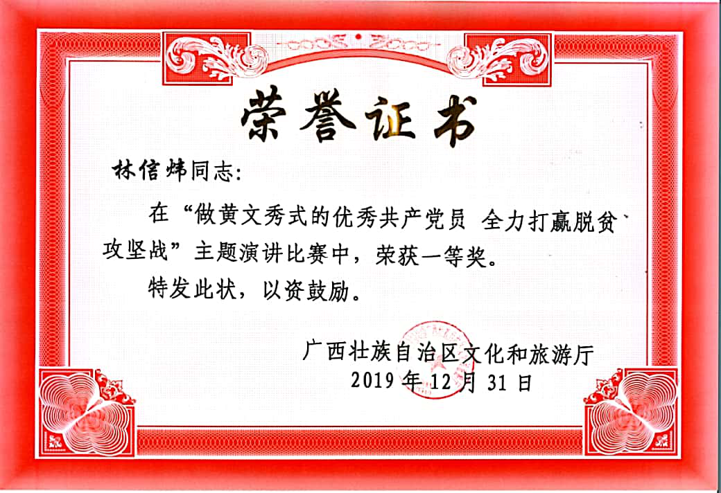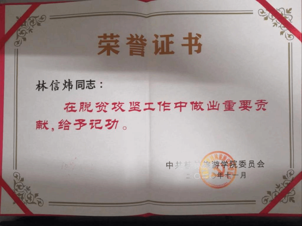 林信炜,2010级对外汉语2。在校期间曾任芝山剧社副社长,《龙江青年》新闻部副部长。曾获全国第二届校园戏剧剧本征稿比赛创作奖,校两赛戏剧表演一等奖、编剧一等奖、剧评一等奖、影视配音一等奖、员工访谈一等奖、十佳选手等荣誉。现任桂林旅游公司休闲与健康公司团委书记,挂任桂林市资源县梅溪镇胡家田村党总支第一书记。个人特长:写作、表演。