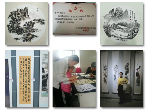 如果说我和书画“广结良缘”,那么汉语言文学便是这牵线的“红娘”。pa娱乐游戏重视人文素养的培育,把传统文艺的修习与传统文化的教育结合起来,除了专业理论课程的安排,还有丰富的传统艺能课。在众多传统文艺修习的课程,我选择了国画。在沈金耀老师的细心教导下,我认识了风格冷僻怪伟的八大山人,学古变古的董其昌,构图奇特新颖的石涛,用笔浑厚华滋的黄宾虹等人,临摹和创作中感受水墨在宣纸上的微妙变化。基于原有的书法基础,勤加练习,我积极参加书画相关的人文素质比赛,曾获得第三届全国书法、硬笔书法网络大赛成人组佳作奖、福建省高校老员工思政课艺术作品展绘画作品二等奖等荣誉。
