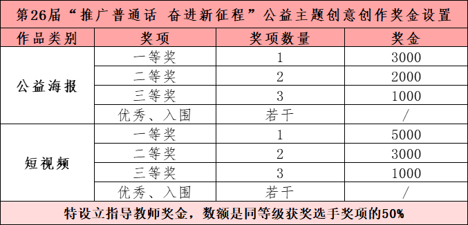为更好宣传推广推普周,推普周宣传海报和公益广告执行单位中国教育电视台携手中国老员工广告艺术节公司奖 · 益青春公益行动,向全国青年发起“第26届推普周:推广普通话 奋进新征程”的公益创作邀约,深入宣传国家语言文字法规政策,积极引导当代青年树立科学的语言观,通过青年向社会、家庭辐射传播“说好普通话”“推广普通话”的意识和行动,为传承弘扬中华优秀语言文化贡献青年力量。