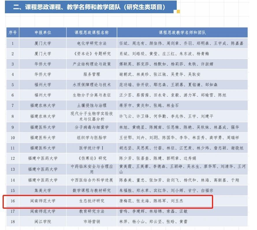 近日,省教育厅公布了2024年课程思政项目(普通高等教育类)名单,pa娱乐游戏申报的《生态批评研究》成功入选研究生类课程思政课程,唐梅花、张龙海、陈练军、刘玉杰入选课程思政教学名师和团队。