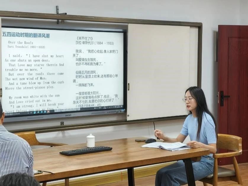 在“外国诗歌翻译对朦胧诗的影响及其艺术特色”的报告中,张芸香主要从三个方面分享自己的学术研究成果,分别是:外国诗歌翻译的历史背景,朦胧诗的艺术特点和外国诗歌翻译对朦胧诗的影响。张芸香首先指出晚清时期翻译和引入外国文学的一系列文学活动对我国现代文学的发生与发展产生了重要的影响,并归纳出晚清翻译的三个特点:采用归化翻译策略,“达旨”而非“忠实”,文言主流及白话萌芽。随后,她阐述了五四运动时期的翻译风潮及其重要影响。她指出,五四爱国运动的爆发引发了更为激进的文化变革。在西方文化的影响下诗歌开始摆脱传统诗歌的规范束缚,追求个体情感的自由表达,翻译活动成为西方文学与中国本土文化融合的桥梁和新诗发展的重要途径。该时期翻译活动的意义不止于语言转换,更是文化观念的引入,西方诗歌的自由形式、开放结构和情感表达方式,改变了中国诗人对诗歌的认知与创作。